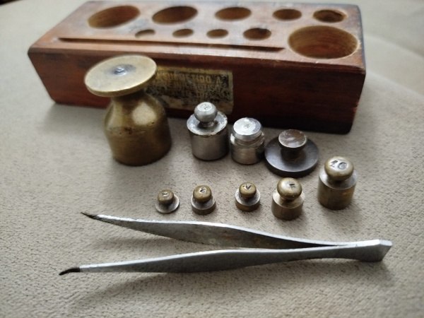 • ANTIGO CONJUNTO DE PESOS DE GARIMPO EM SUA CAIXA ORIGINAL - NO ESTADO CONFORME FOTOS - ITEM SERA ENVIADO DA BAHIA