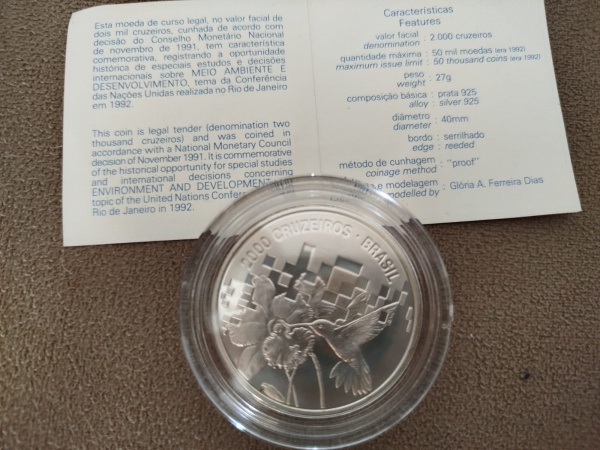 • MOEDA BRASIL COMEMORATIVA 2000 CRUZEIROS 1992 - CONFERENCIA DAS NAÇOES UNIDAS SOBRE MEIO AMBIENTE E DESENVOLVIMENTO - PRATA 925 - 27 GRAMAS - 40MM - ITEM EM SUA EMBALAGEM ORIGINAL - EM OTIMO ESTADO CONFORME FOTOS - ITEM SERA ENVIADO DA BAHIA