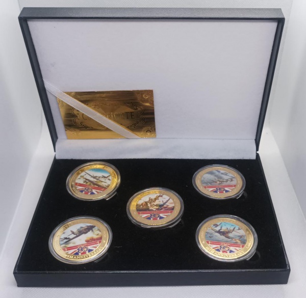 • CONJUNTO CONTENDO 5 MEDALHAS COMEMORATIVAS DE 80 ANOS DA BATALHA AEREA DA GRÃ-BRETANHA - FOI UMA BATALHA AEREA QUE MARCOU UM MOMENTO DE VIRADA NA SEGUNDA GUERRA MUNDIAL, SENDO ESSA A PRIMEIRA DERROTA SIGNIFICATIVA PARA AO ALEMAES. A ROYAL AIR FORCE VENCEU A LUFTWAFFE, EVITANDO A INVASAO DAS ILHAS BRITANICAS. - ITEM EM PERFEITO ESTADO CONFORME FOTOS
