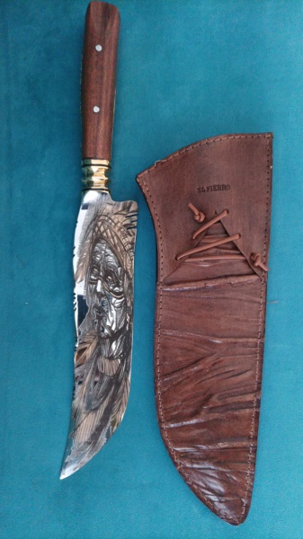 • MARAVILHOSA FACA FORJADA AÇO INOX COM DESENHO DE INDIO EM GOLD - MARCA EL FIERRO - TAMANHO DA LAMINA 10 POLEGADAS - ACOMPANHA BAINHA - EM PERFEITO ESTADO CONFORME FOTOS