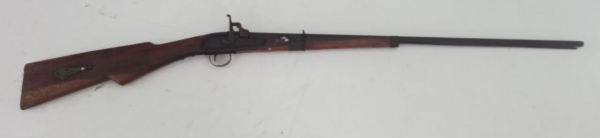 • ANTIGA ESPINGARDA DE CAÇADOR, PRODUZIDA EM AÇO E MADEIRA, MAIOR COMPRIMENTO 120 CM, SÉCULO XIX/XX, ITEM INUTILIZADO, NO ESTADO.
