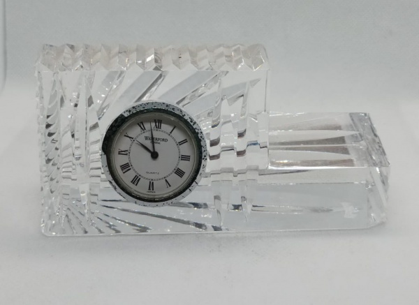 • RELOGIO DE MESA EM CRYSTAL COM PORTA CANETA COM PEQUENO QUEBRADO NO CANTO DIREITO INFERIOR - MEDIDAS 12,5x6x4CM - FUNCIONANDO PERFEITAMENTE - NO ESTADO CONFORME FOTOS