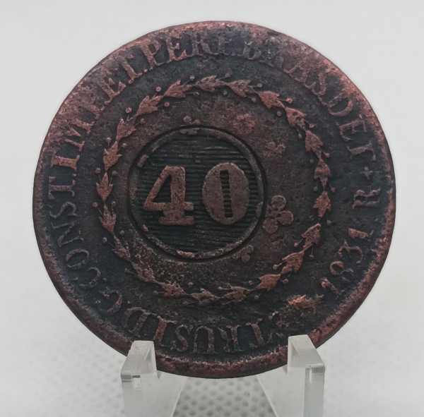 • MOEDA BRASIL IMPERIO - 80 REIS 1831 COM CARIMBO GERAL DE 40 REIS - MBC - COBRE - 26,68 GRAMAS - 40MM