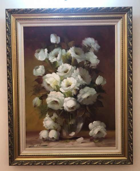 • PINTURA OLEO SOBRE TELA - DENOMINADA ROSAS BRANCAS - ARTISTA DAVI DAGOBERTO VITOR - ASSINADA PELO ARTISTA - LINDA MOLDURA - MEDIDA TELA - 70 X 50 CM  E COM MOLDURA 99 X 79 CM - EM PERFEITO ESTADO CONFORME FOTOS
