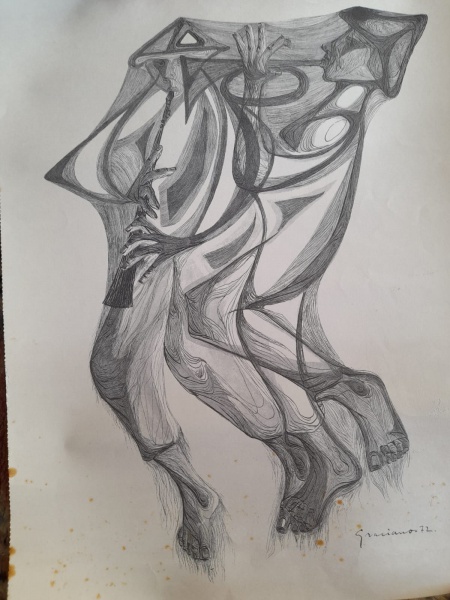 • LINDO DESENHO DE CLOVIS GRACIANO NAQUIM SOBRE PAPEL - DENOMINADO FLAUTISTAS -MEDINDO 24 X 25,5CM - ASSINADO E DATADO 1972 - NECESSITA RESTAURO (FUNGOS) - NO ESTADO CONFORME FOTOS