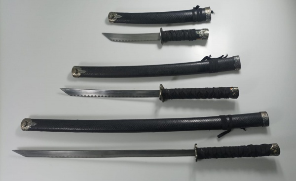 • CONJUNTO COM 3 ESPADAS SAMURAI PARA DECORACAO EM AÇO SEM FIO DE CORTE, MEDINDO RESPECTIVAMENTE DA MAIOR PARA MENOR 70CM, 51C, 33CM - NO ESTADO CONFORME FOTOS