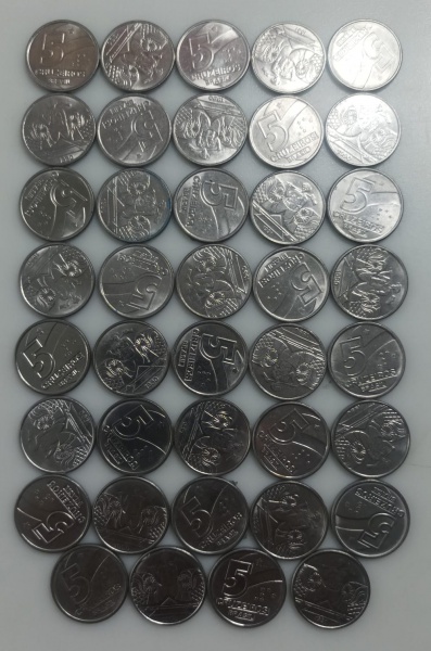 • 39 MOEDAS 5 CRUZEIROS 1990 A 1992 - AÇO-INOX - 4 GRAMAS - 21,5 MM - LOTE AVALIADO ENTRE R$ 60,00 A R$ 160,00 - NO ESTADO CONFORME FOTO