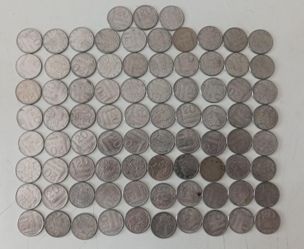 • 83 MOEDAS 20 CENTAVOS 1967 A 1979 - CUPRO-NIQUEL / AÇO-INOX - 7,8 OU 5,7 GRAMAS - 25 MM - LOTE AVALIADO ENTRE R$ 125,00 A R$ 250,00 - NO ESTADO CONFORME FOTO