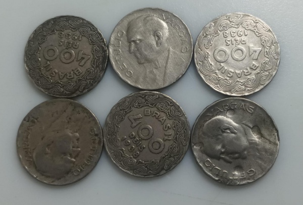 • 8 MOEDAS 100 REIS 1938 a 1942 - CRUPO-NIQUEL - 2,5 GRAMAS - 17MM - LOTE AVALIADO ENTRE R$ 32,00 A R$ 80,00 - NO ESTADO CONFORME FOTO