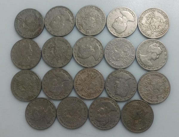 • 19 MOEDAS 200 REIS 1901 - CRUPO-NIQUEL - 8 GRAMAS - 25MM - LOTE AVALIADO ENTRE R$ 95,00 A R$ 250,00 - NO ESTADO CONFORME FOTO