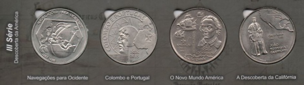 • 4 MOEDAS PORTUGAL 200 ESCUDOS SERIE DESCOBRIMENTOS - 3 SERIE COMPLETA - NAVEGACOES PARA OCIDENTE, COLOMBO E PORTUGAL, O NOVO MUNDO AMERICA, A DESCOBERTA DA CALIFORNIA